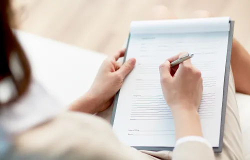 初診の方には、現在の症状や既往歴、服薬中のお薬などをご記入いただきます。問診票を書き終えましたら受付窓口にご提出ください。番号札をお渡しします。